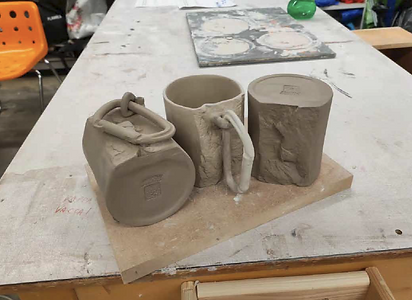 Now the clay is leather hard so I trimmed it and install handles on it. When I trimmed it something random happened. My trimming tool starts bouncing on the clay and couldn’t be able to cut through the surface of the clay and creating a wavy texture on the wall of my cups. At first I thought it’s the clay is a bit too dry then I went down stairs to consult James. I learned that it’s because I was holding the tool too loose and if I want to get rid of that texture I can only use the sharp end of my trimming tool to cut lines that are a bit deeper than usuall because the pressure is higher so my tool won’t bounce off.